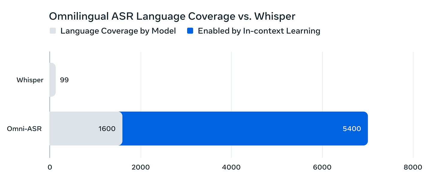 Scribe v2 Realtime sets a new standard for low-latency Speech to Text. Designed for live use cases—voice agents, meeting assistants, and real-time captioning—it transcribes speech in under 150 ms across English, French, German, Italian, Spanish, and Portuguese, and 90 languages.Impressive open source work from Meta- Omnilingual ASR: Advancing Automatic Speech Recognition for 1,600+ Languages (with the following chart/diss of OpenAIs’ Whisper model)